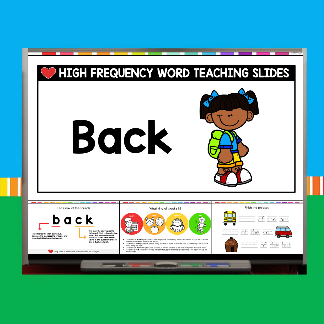 This download includes a ready-to-use PowerPoint for the sight word Back. Inside, you’ll find: