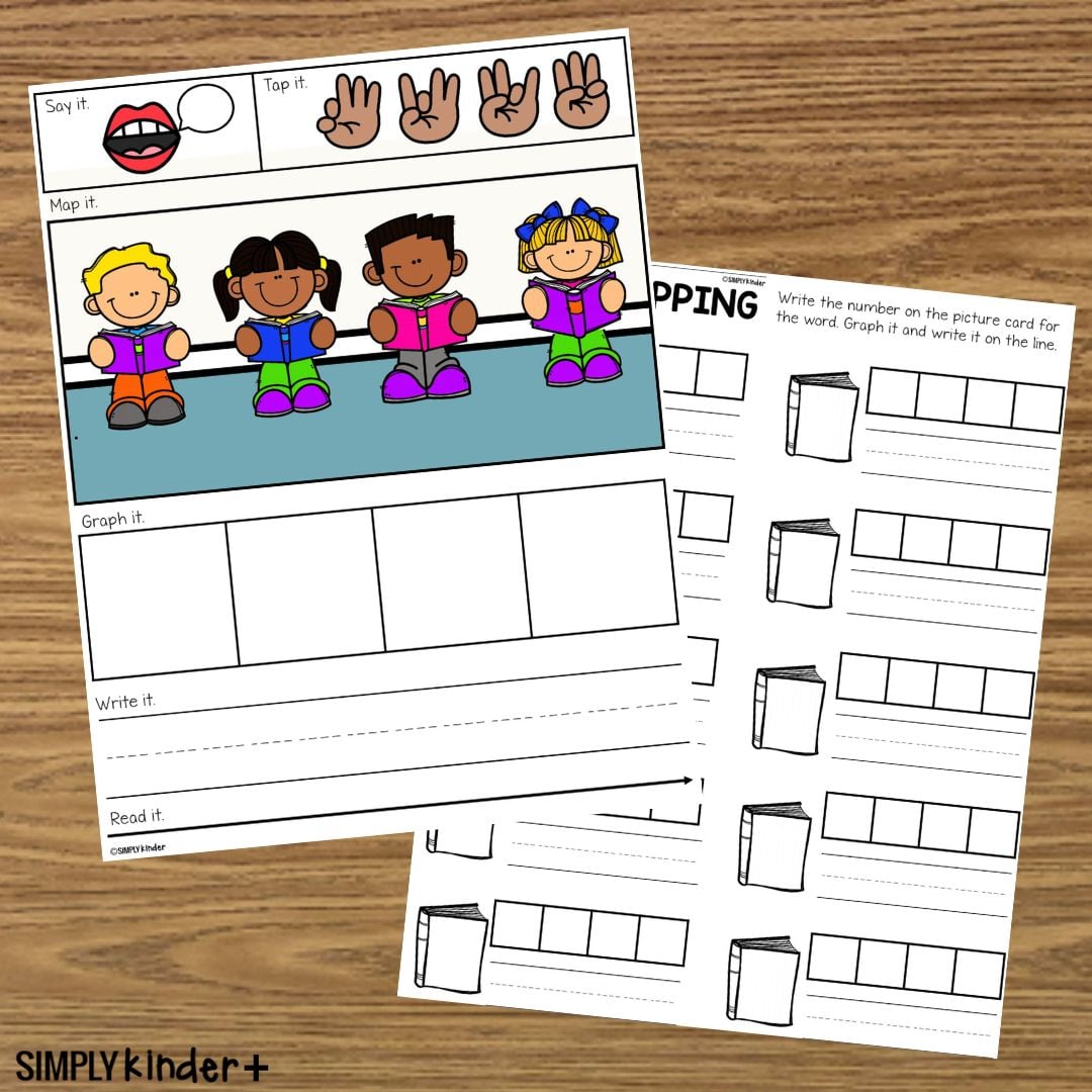 Work with your students to go from speech to print with this fun, colorful word mat, and center activity page. The full-color mat can be used inside a dry erase pocket and has students say the word, tap the word, map the word, graph the word, write the word, and reread what they wrote. The center activity page reinforces the skills as students work independently. Download includes 4 and 5 sound box pages.