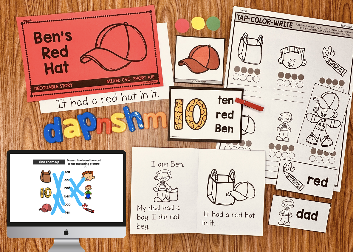A Science of Reading Aligned Decodable Reader with Word Work Activities for Short A and E: Ben’s Red Hat. Use the printable & digital activities to support decoding, segmenting, blending, reading fluency, and more with this huge set of activities.