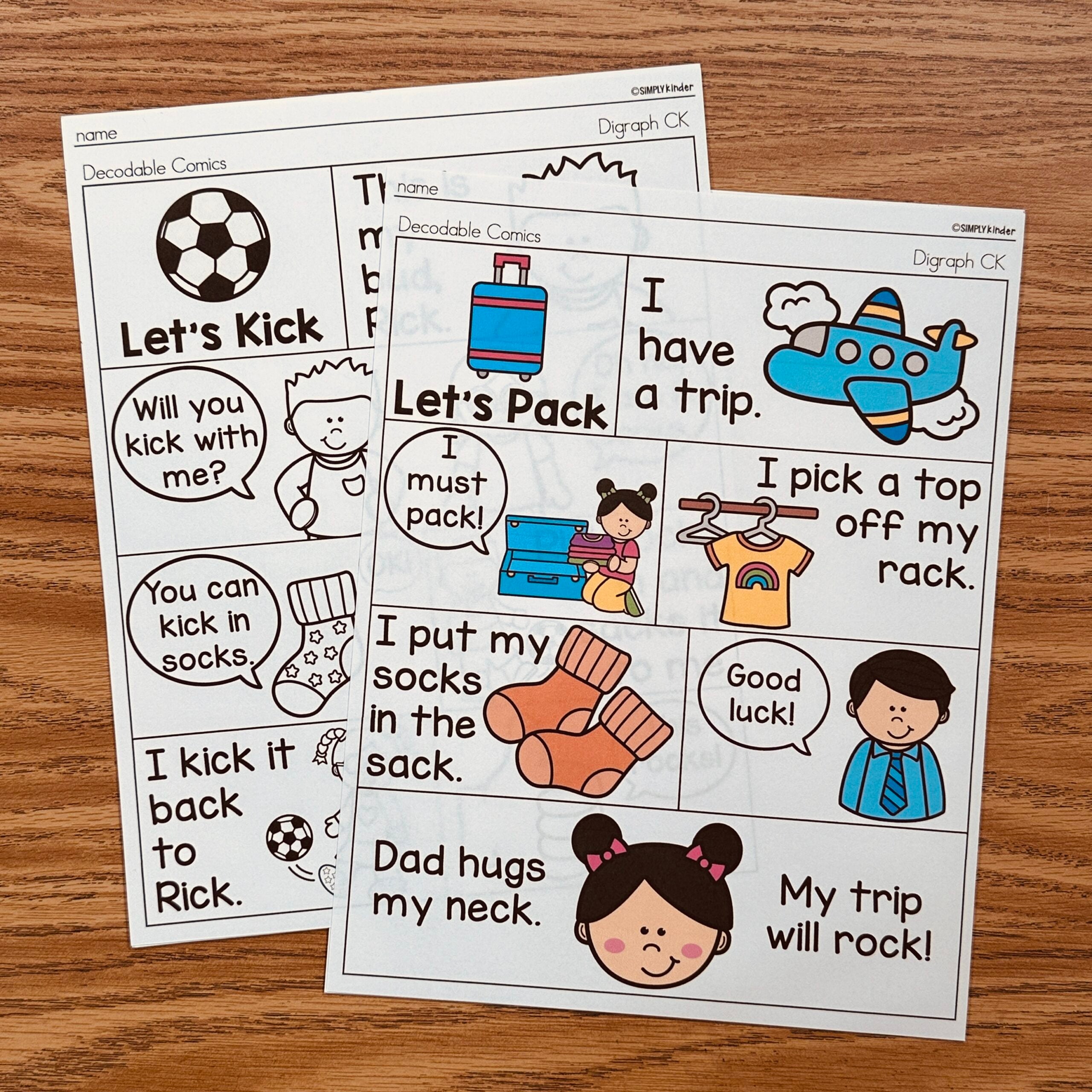 This set includes the comics in color, black and white, and a matching comprehension practice page appropriate for kindergarten and first grade. This set is for digraph CK.