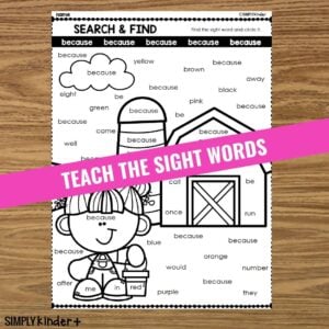 Practice sight words with a fun word search! Perfect for kindergarten, as the word only appears left to right and top to bottom and never intersect. At the end, they will count how many times they found the word and write the number. (It’s fun to color the words in different colors so you can see them clearly).