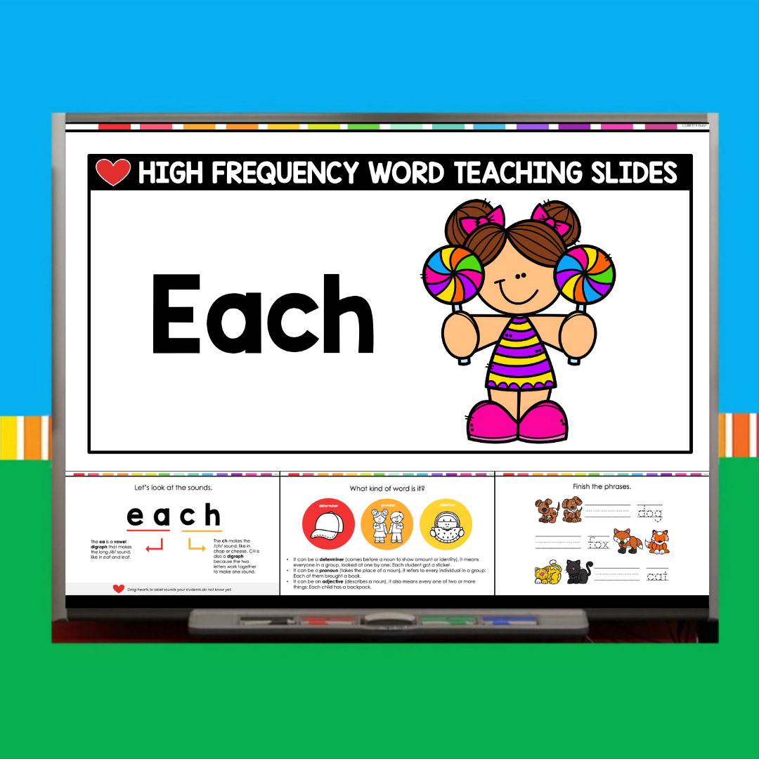 This download includes a ready-to-use PowerPoint for the sight word Each. Inside, you’ll find: