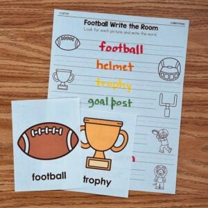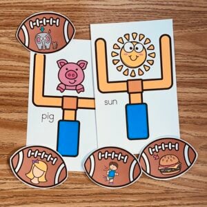Included in this download is a print and play center for practicing CVC words. Students will feed the trophy the footballs and record they word they wrote.