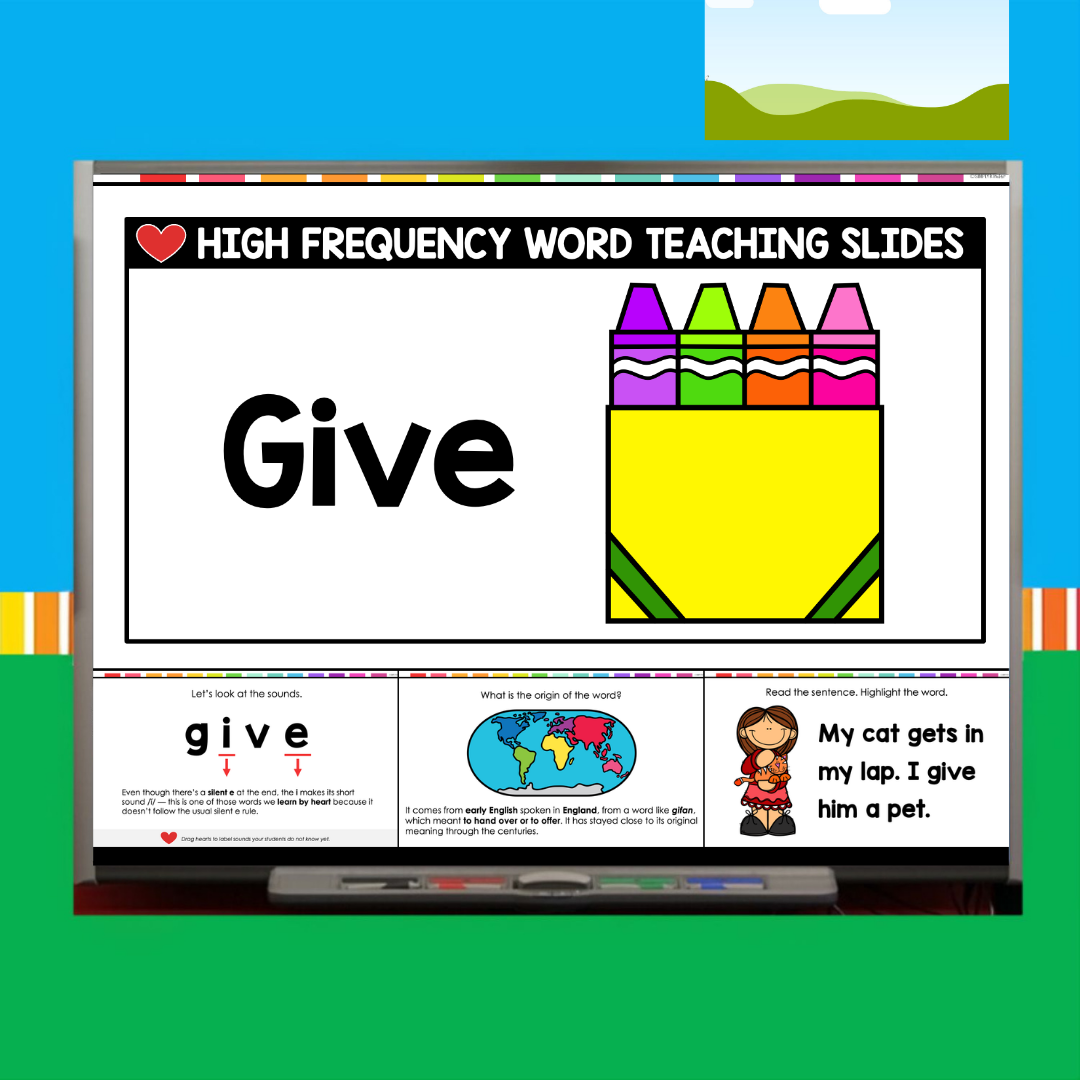 This download includes a ready-to-use PowerPoint for the sight word Give. Inside, you’ll find: