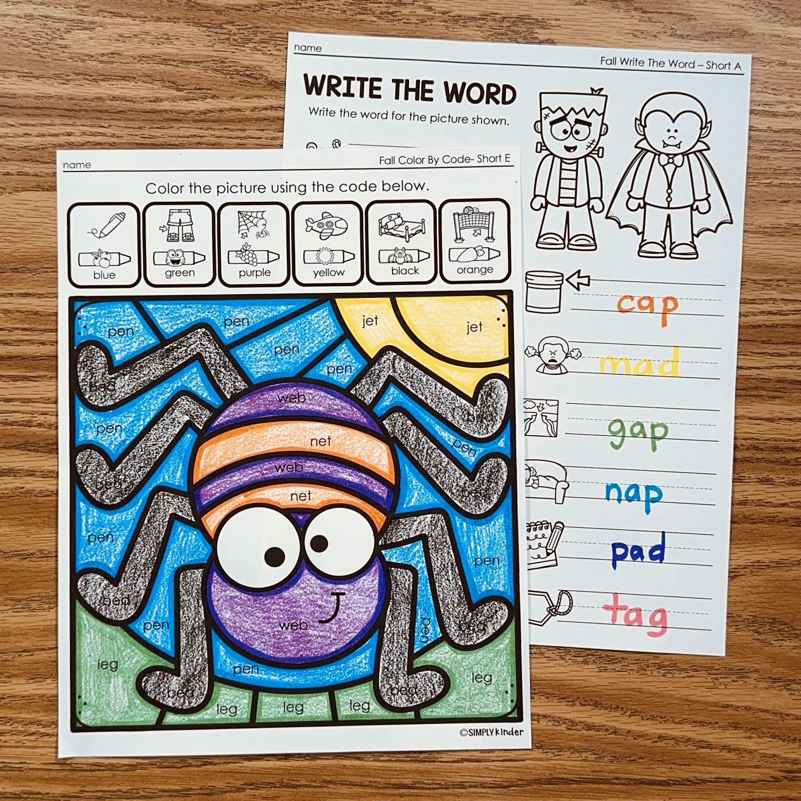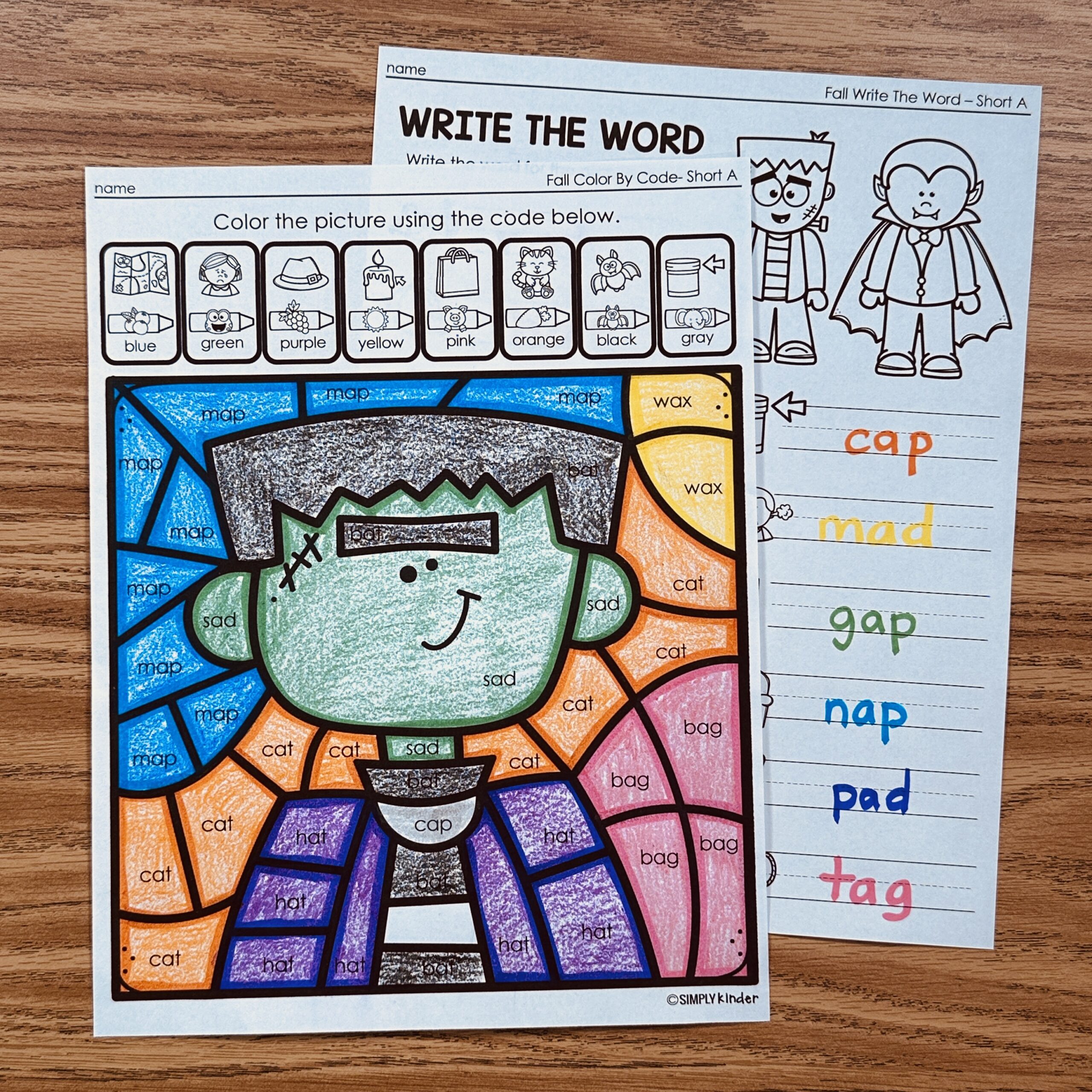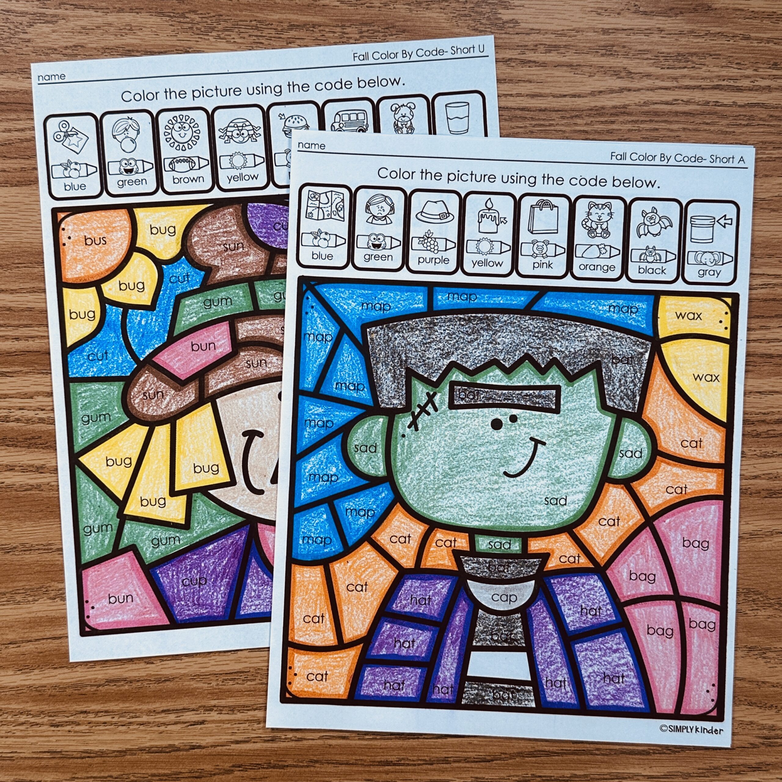 This is a set of Color By Code Printables for CVC practice all with the Halloween theme! Students will read the words and color them by the picture code.