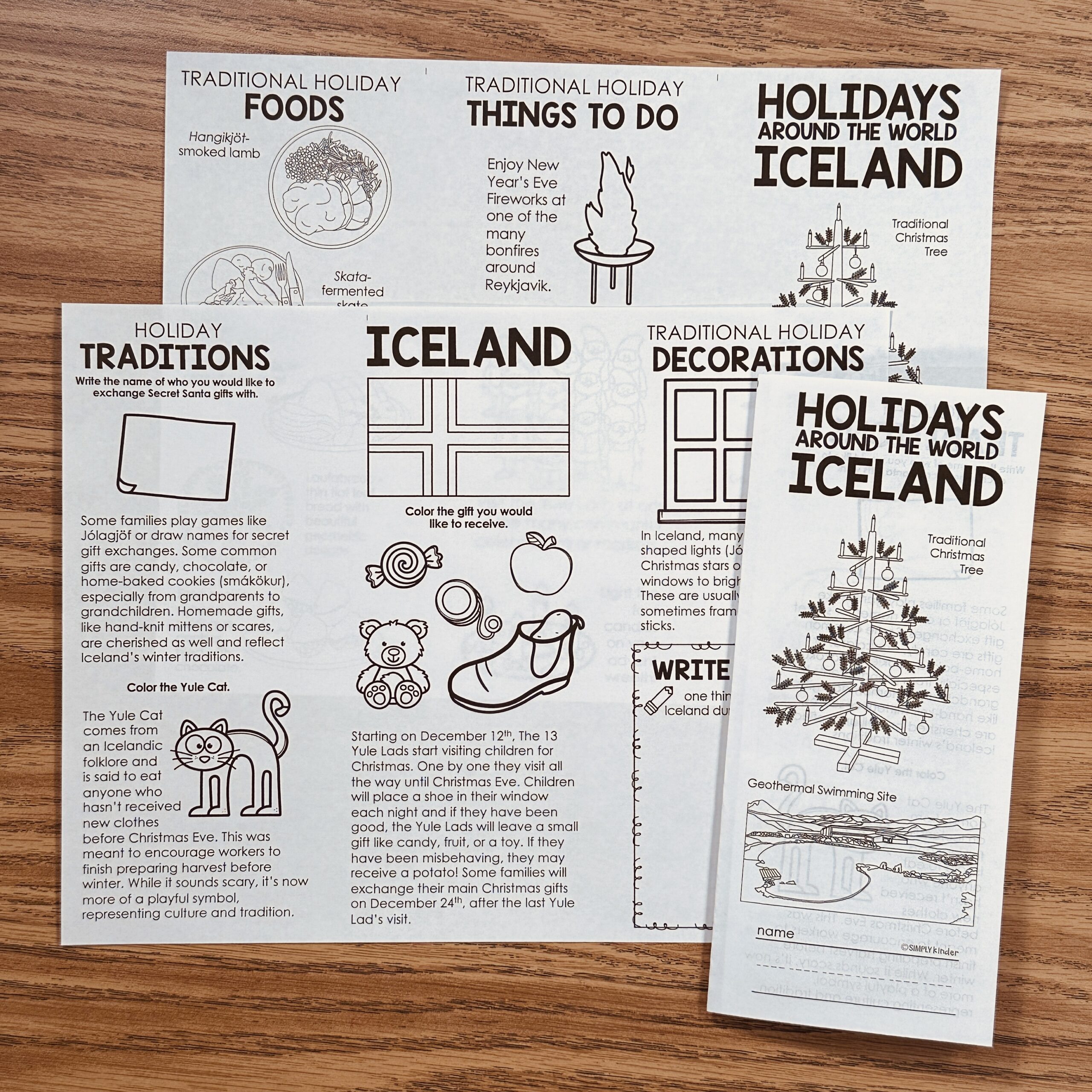 A foldable brochure loaded with information about the most celebrated holiday in Iceland. There is a dedicated 1/3 page for holiday foods, holiday decorations, and things to do in different places around the country with a map. The other pages include different traditions and facts about the country. (Christmas)