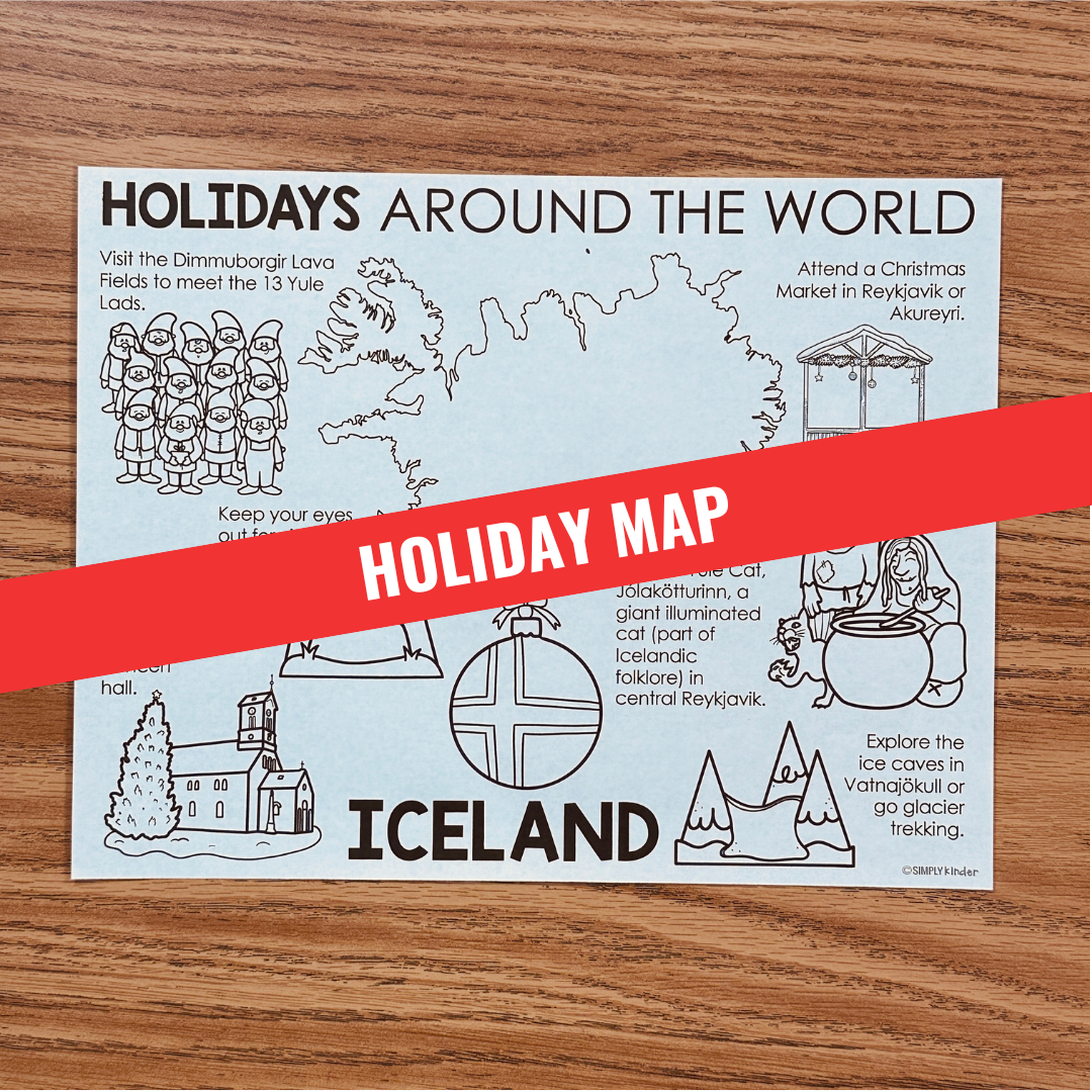 This is a one page printable map with some key cities and different holiday traditions for that you can do in Iceland during the holidays. (Christmas).