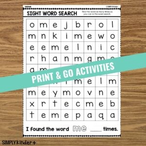 Practice sight words with a fun word search! Perfect for kindergarten, as the word only appears left to right and top to bottom and never intersect. At the end, they will count how many times they found the word and write the number. (It’s fun to color the words in different colors so you can see them clearly).