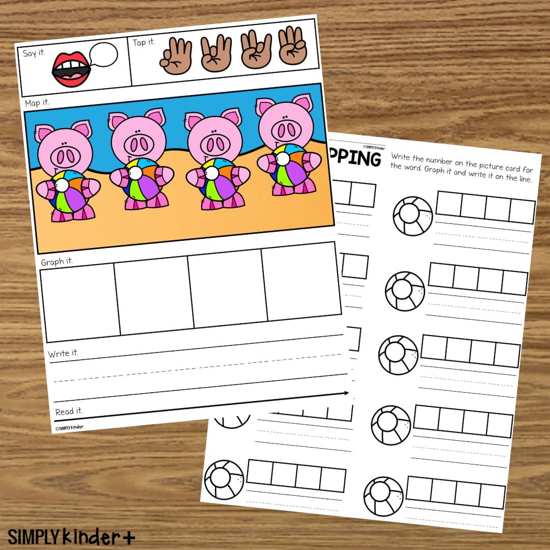 Work with your students to go from speech to print with this fun, colorful word mat, and center activity page. The full-color mat can be used inside a dry erase pocket and has students say the word, tap the word, map the word, graph the word, write the word, and reread what they wrote. The center activity page reinforces the skills as students work independently. Download includes 4 and 5 sound box pages.