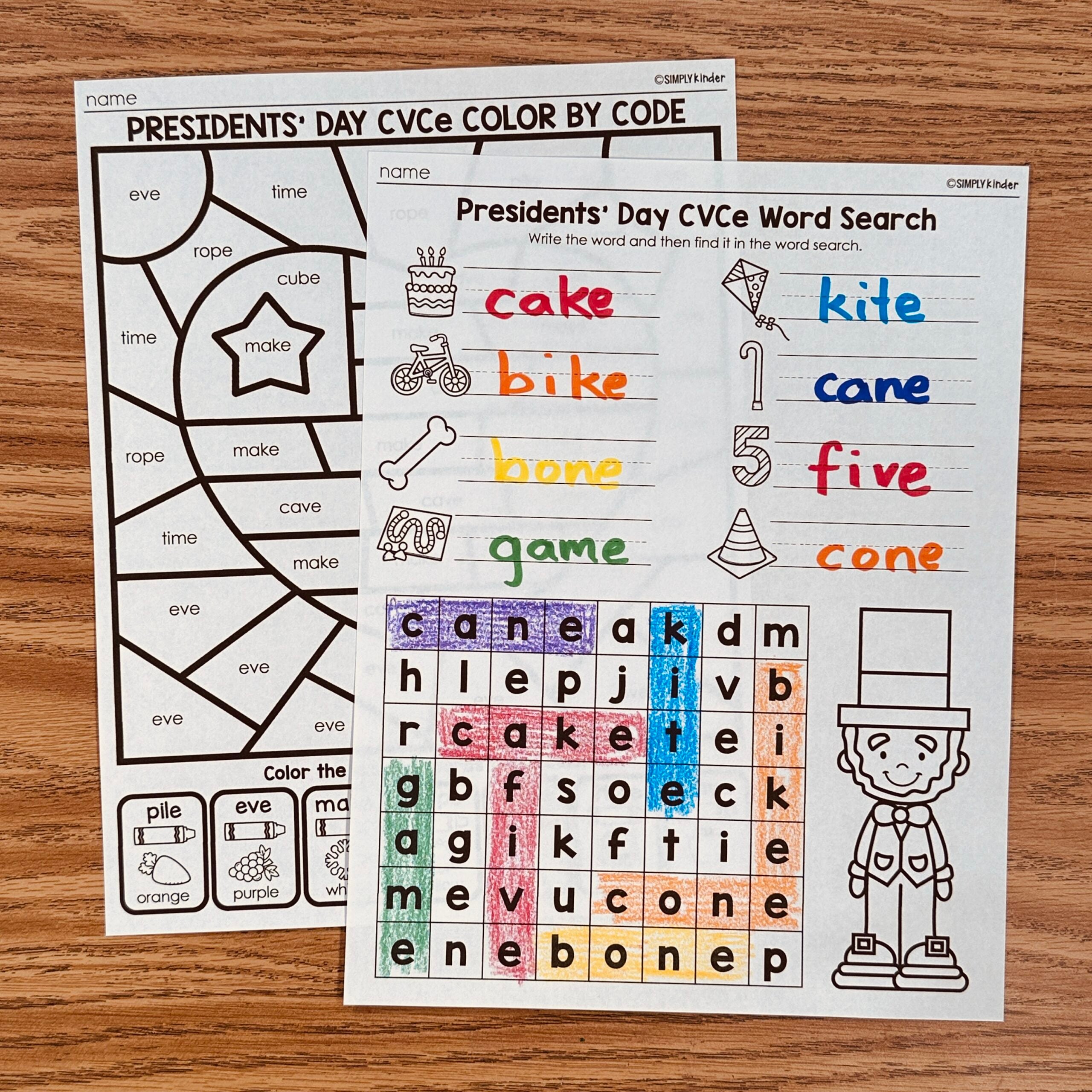 Included in this download are easy printables to work with CVCe words. One is a color by code and the other is a word search.