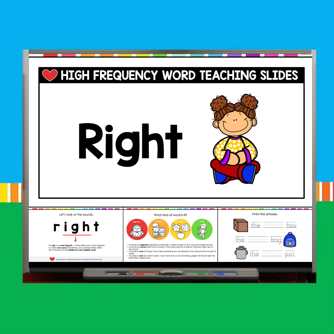 This download includes a ready-to-use PowerPoint for the sight word Right. Inside, you’ll find: