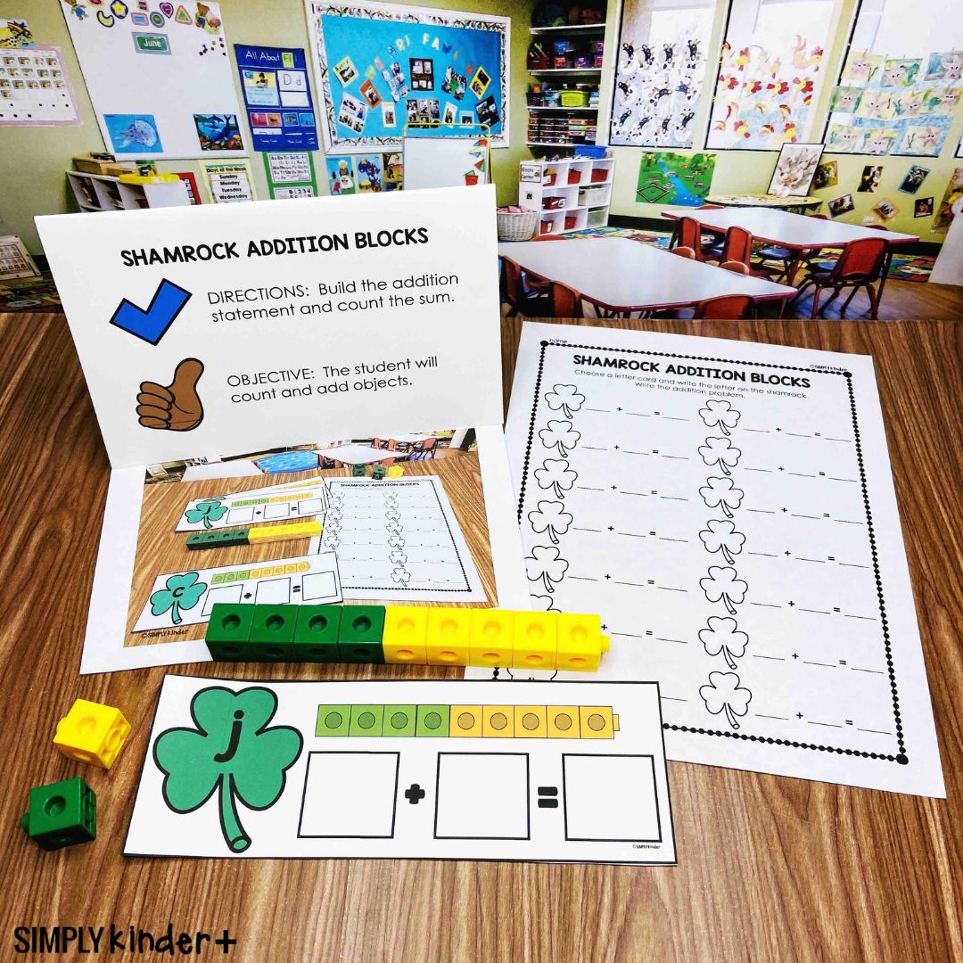 Support math skills with this Shamrock Addition Blocks center for the third quarter of the school. Year-long themed math centers include a print-and-play game, an objective and direction card, and several accountability pages. Perfect for preschool, kindergarten, and first-grade students working on various math skills!