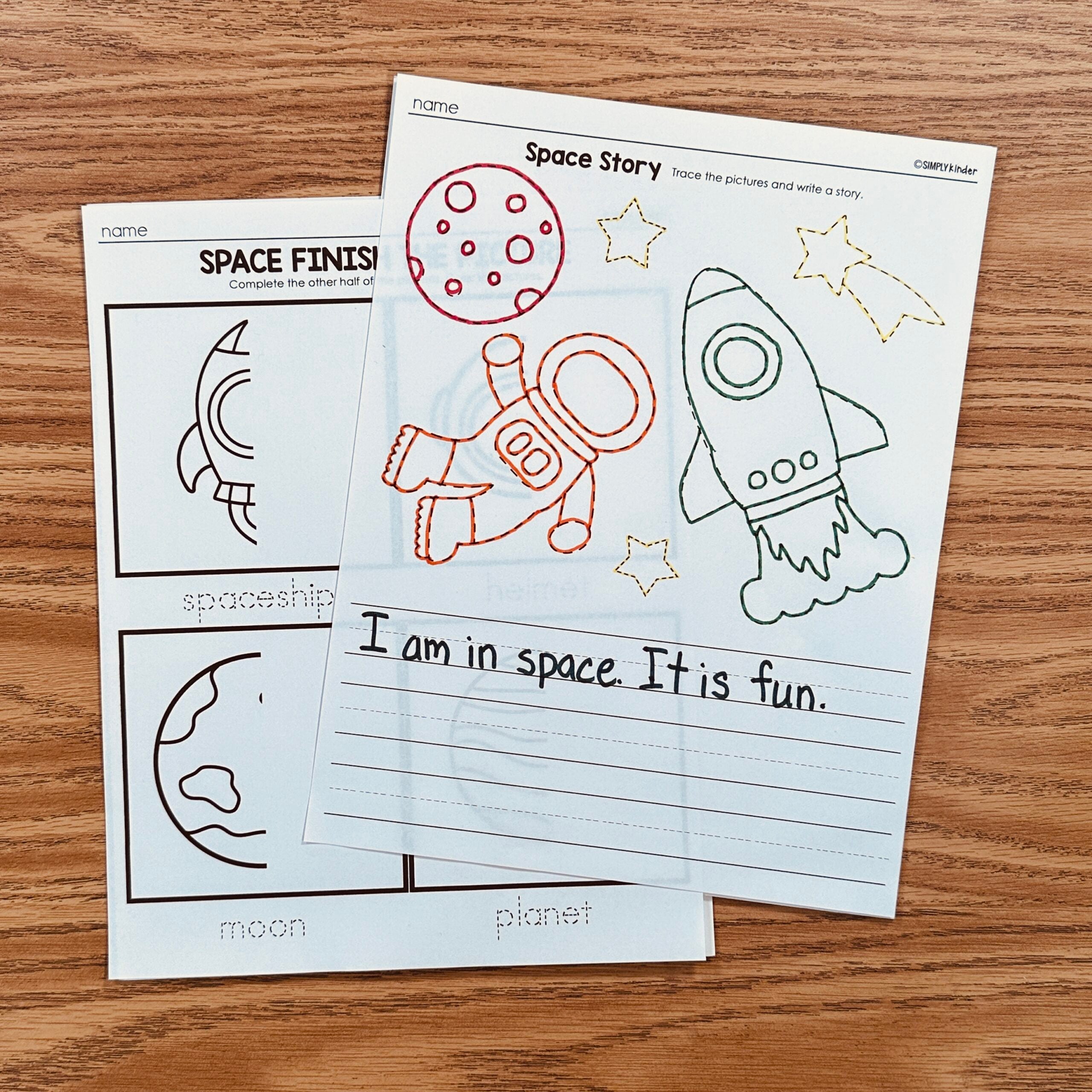This is a set of fine motor printables. It includes activities where students will finish the picture (practicing symmetry) and activities where students will trace the picture and then write a story all with a space theme.