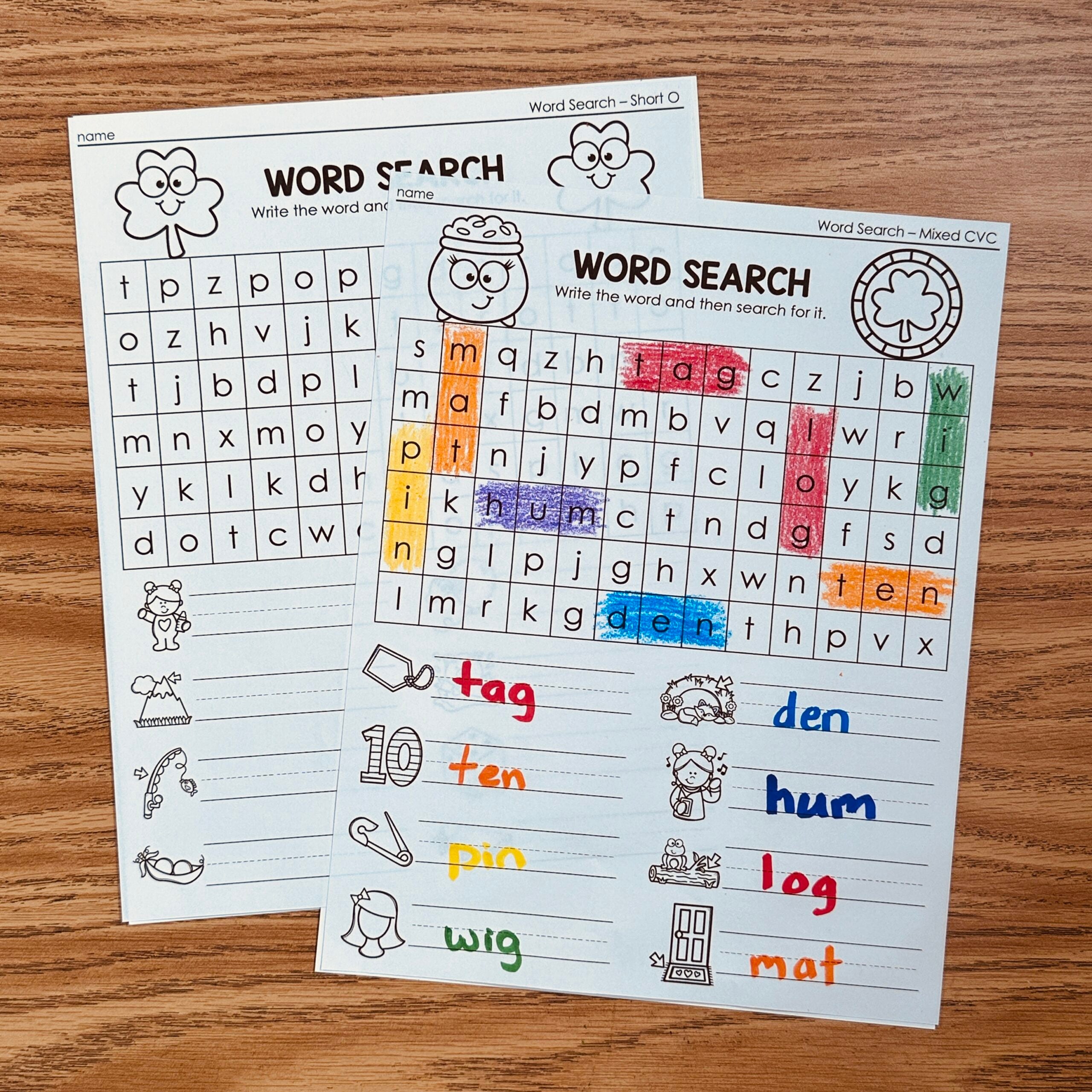 This is a set of Word Search Printables for CVC practice all with the St Patricks Day theme! Students will write the word and then search for it in the word search.