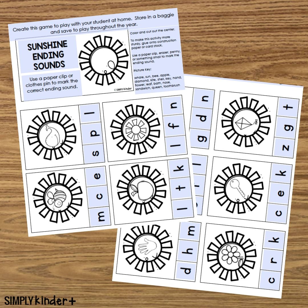 Send this fun center home for your students to work on final sounds with the sun. Families will prep and store them so they can play all year.