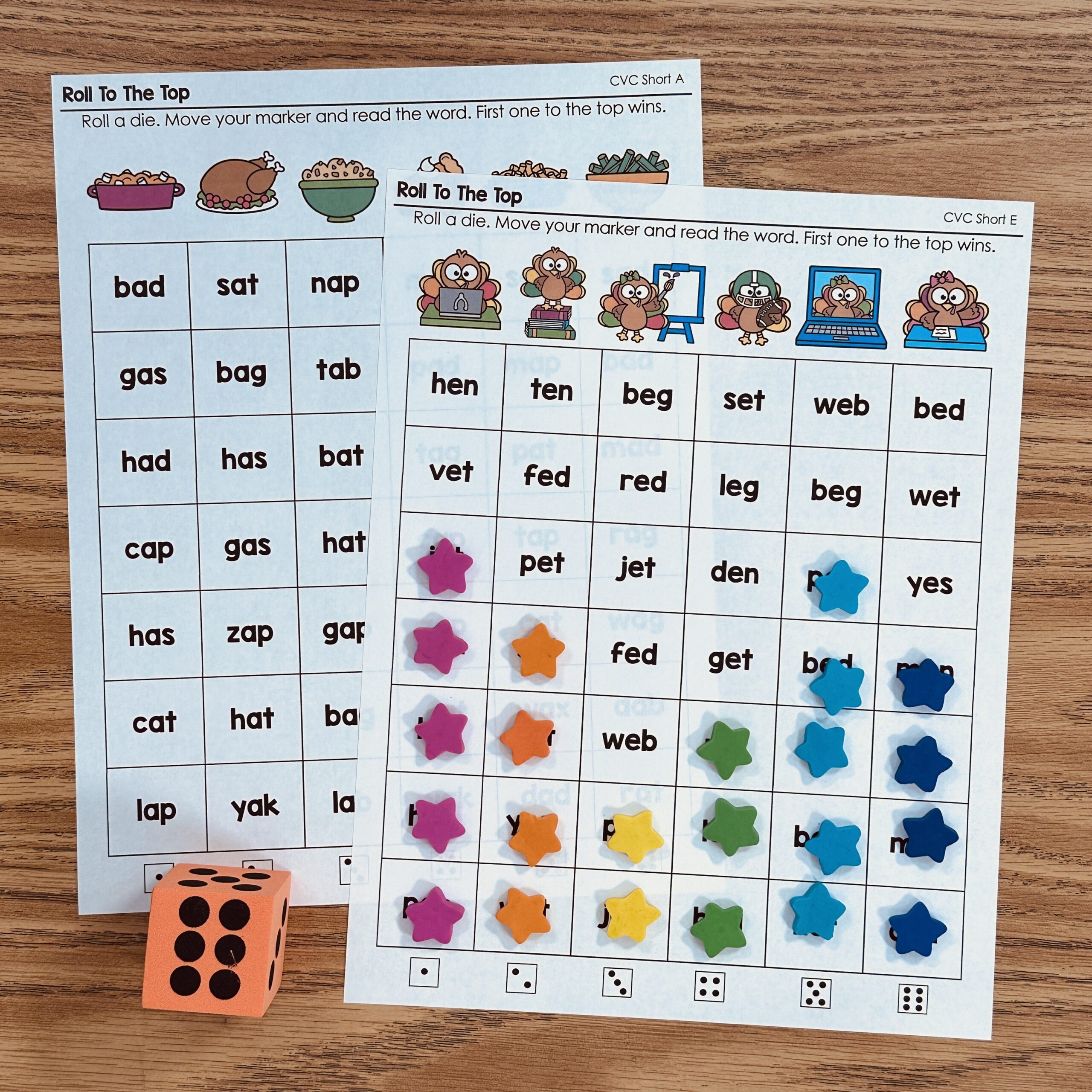 This is a set of Roll To The Top Games for CVC practice all with the Thanksgiving theme! Students will roll the dice and write the word for the number they roll.