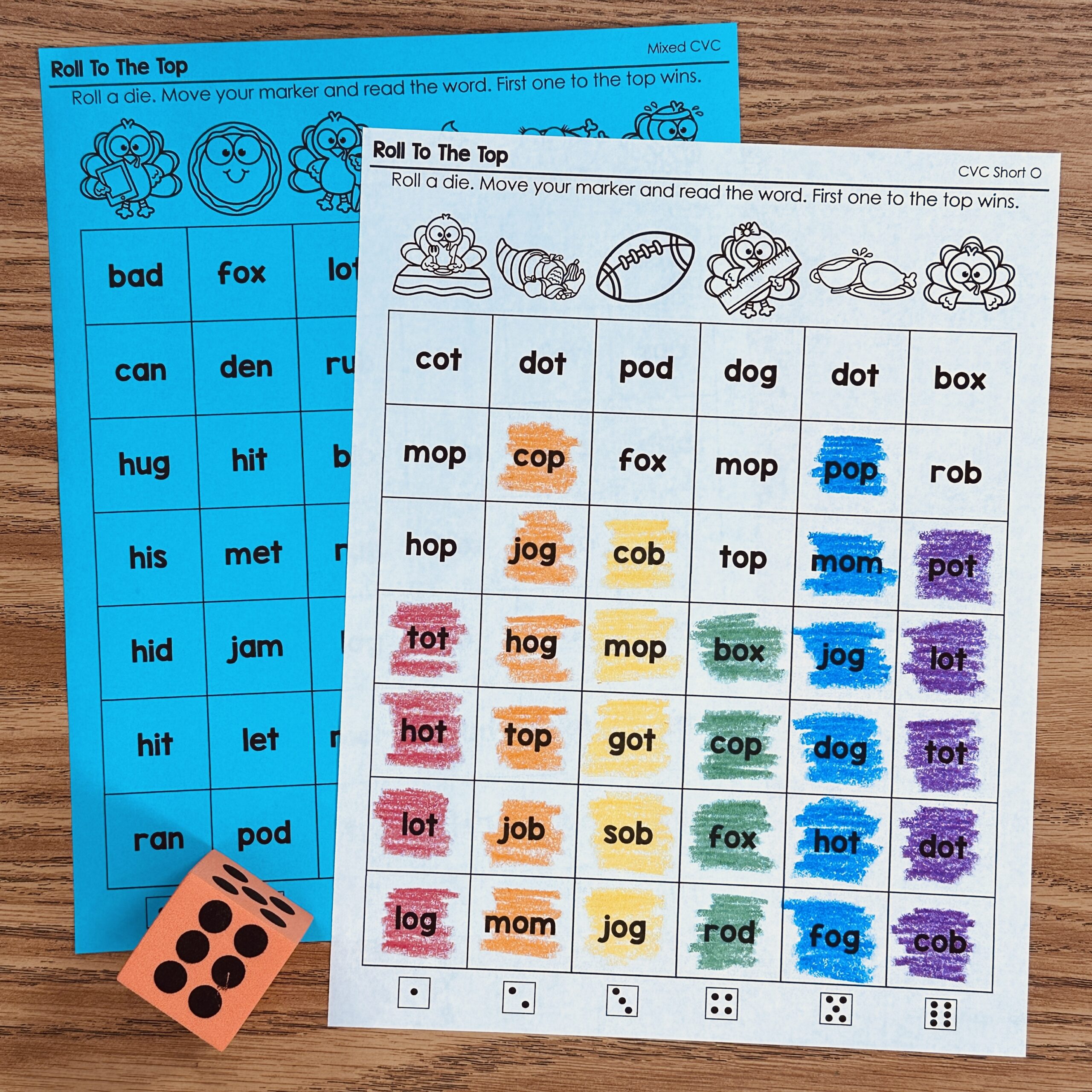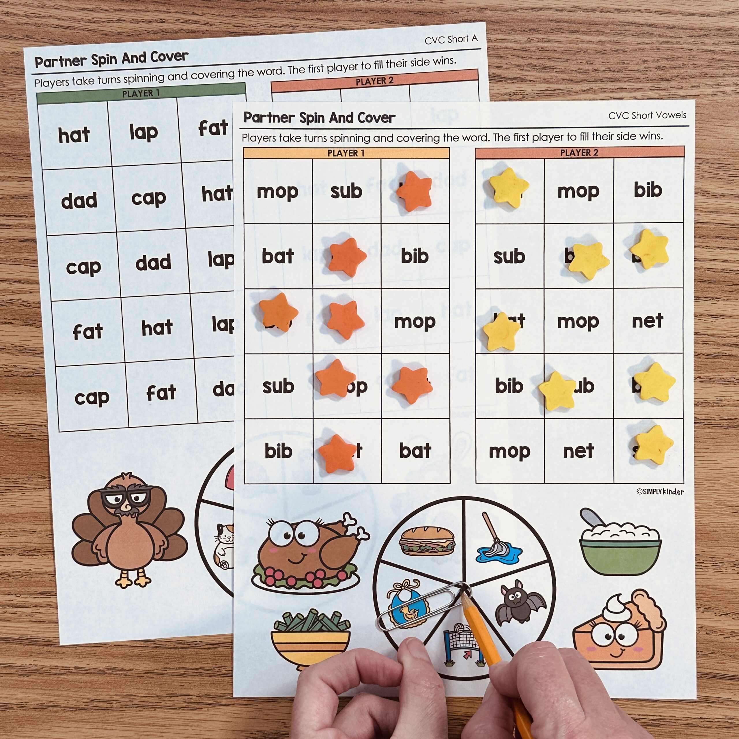 This is a set of Spin And Cover Games for CVC practice all with the Thanksgiving theme! Students will roll a dice, move that many spaces, and read and cover that word.