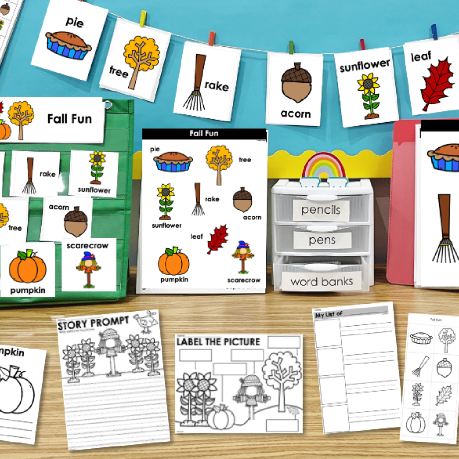 This is a Writing Center all based around a set of themed vocabulary words – Fall Fun. Display the eight words per theme so students can complete the huge variety of different activities to work on writing.