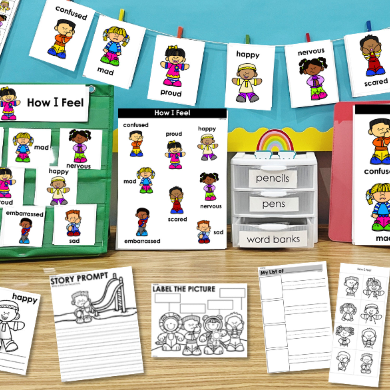 This is a Writing Center all based around a set of themed vocabulary words – Feelings Or How I Feel. Display the eight words per theme so students can complete the huge variety of different activities to work on writing.