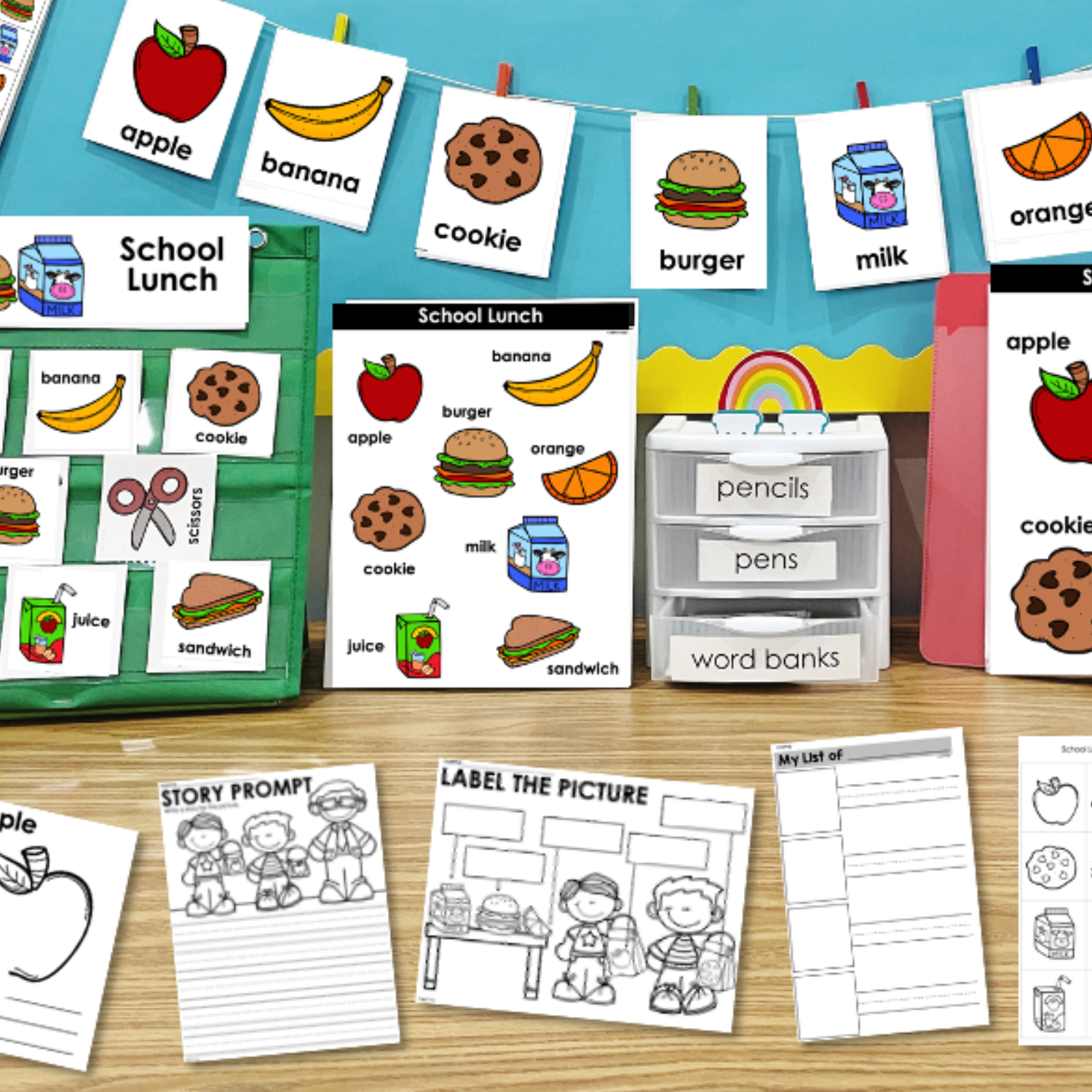 This is a Writing Center all based around a set of themed vocabulary words – School Lunch. Display the eight words per theme so students can complete the huge variety of different activities to work on writing.