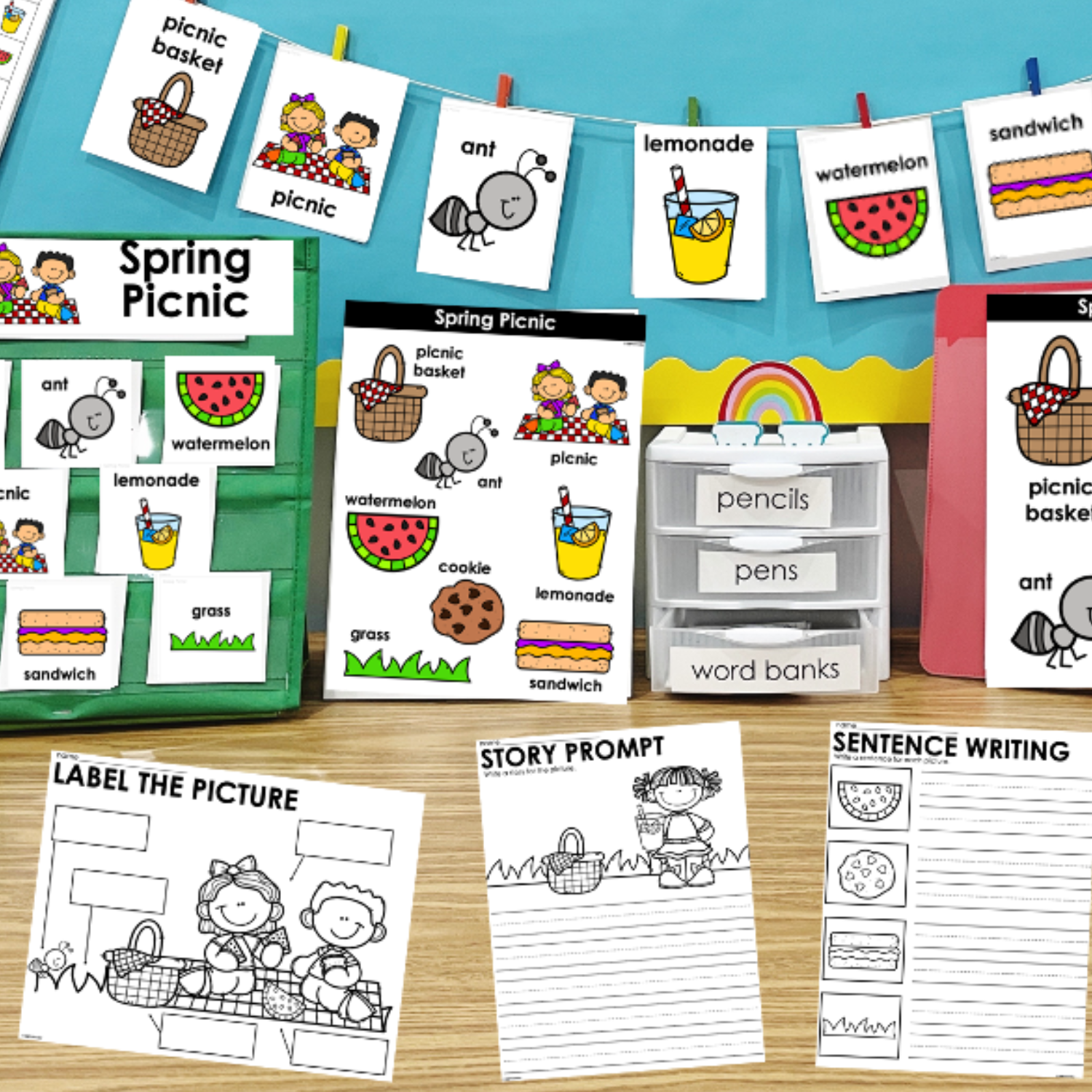 This is a Writing Center all based around a set of themed vocabulary words – Spring Picnic. Display the eight words per theme so students can complete the huge variety of different activities to work on writing.