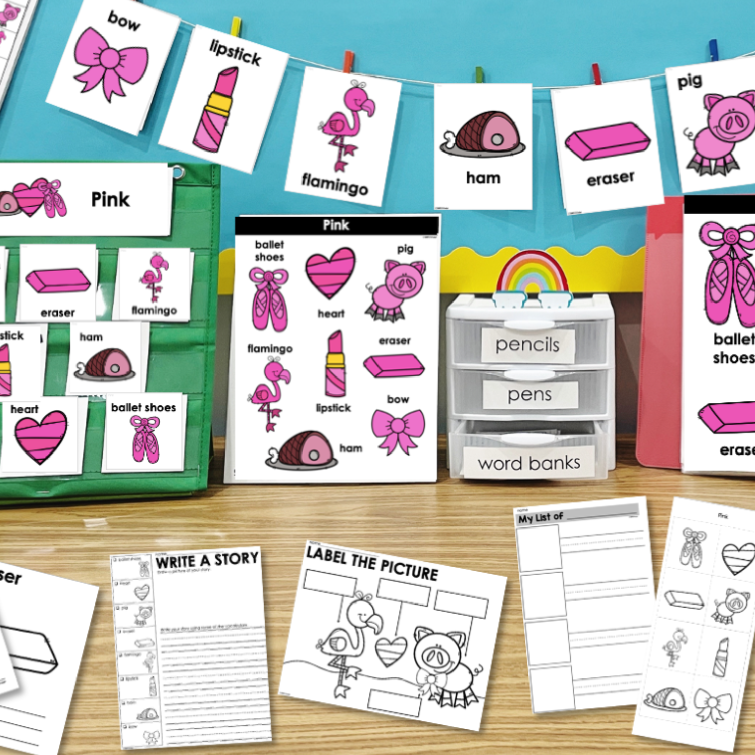 This is a Writing Center all based around a set of themed vocabulary words – The Color Pink. Display the eight words per theme so students can complete the huge variety of different activities to work on writing.